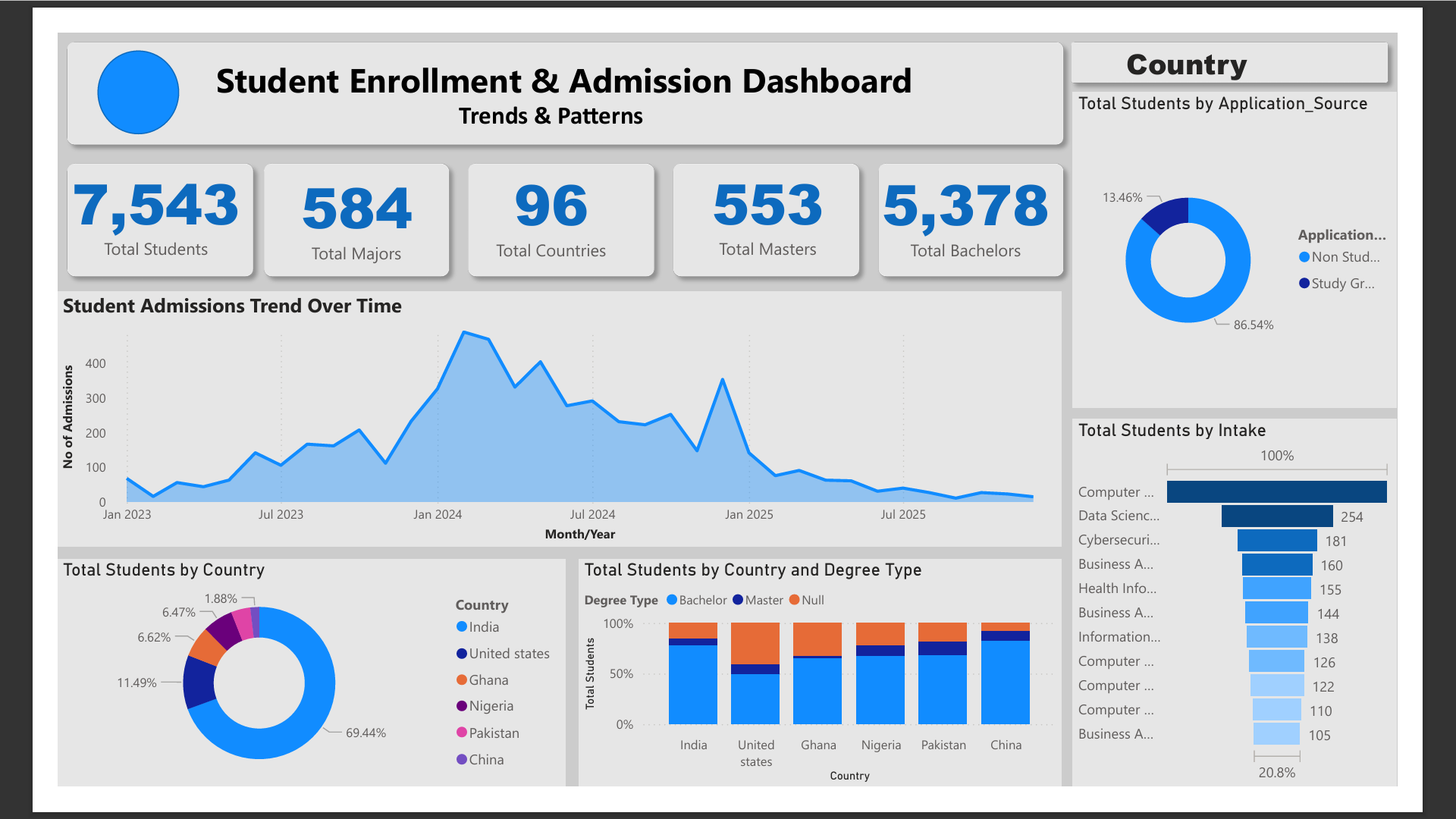 In this project, I used Microsoft Excel and Power BI to analyze Students Enrollment data, detecting what countries and month had the highest influx of admissions, visualized patterns to support data-driven decisions.